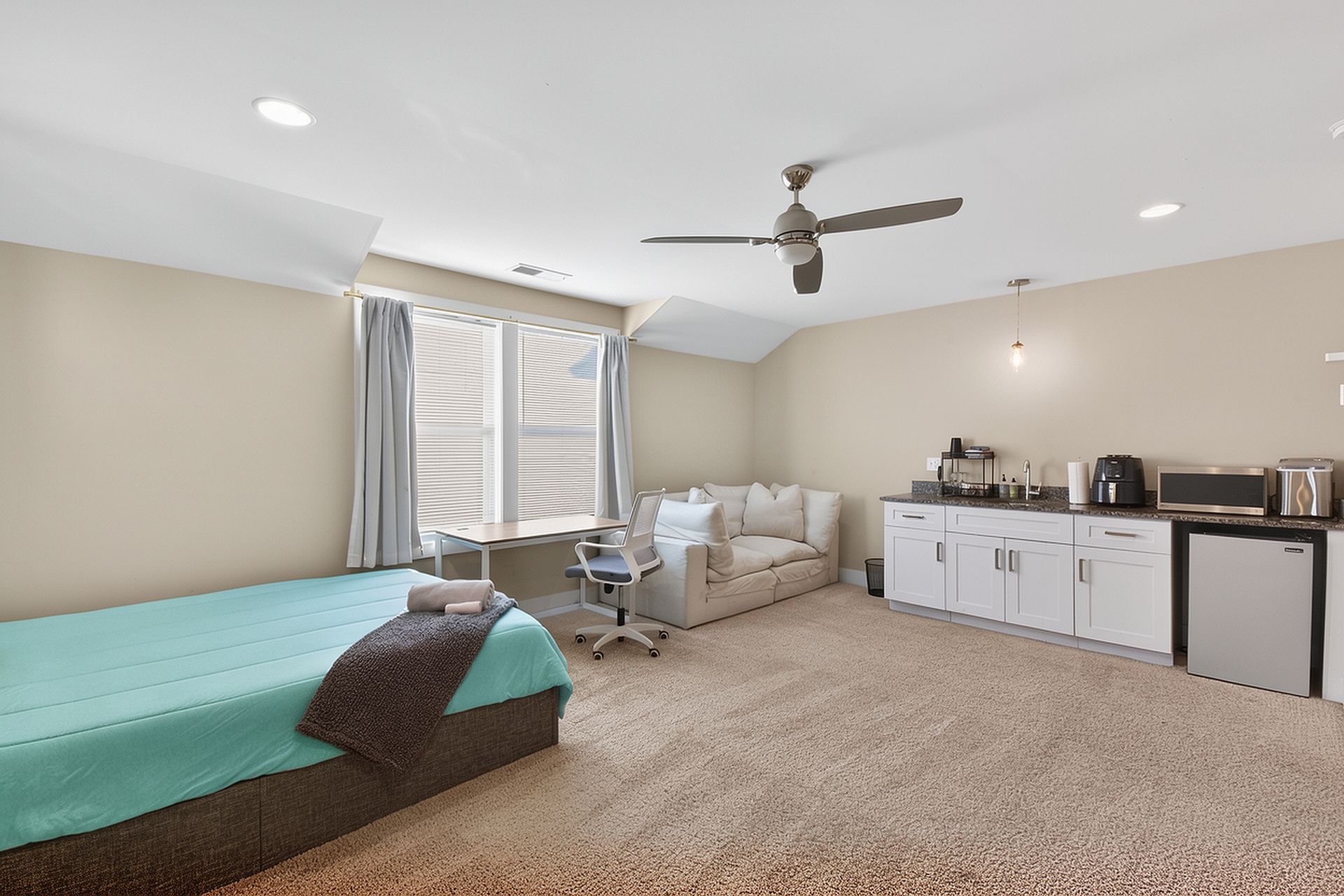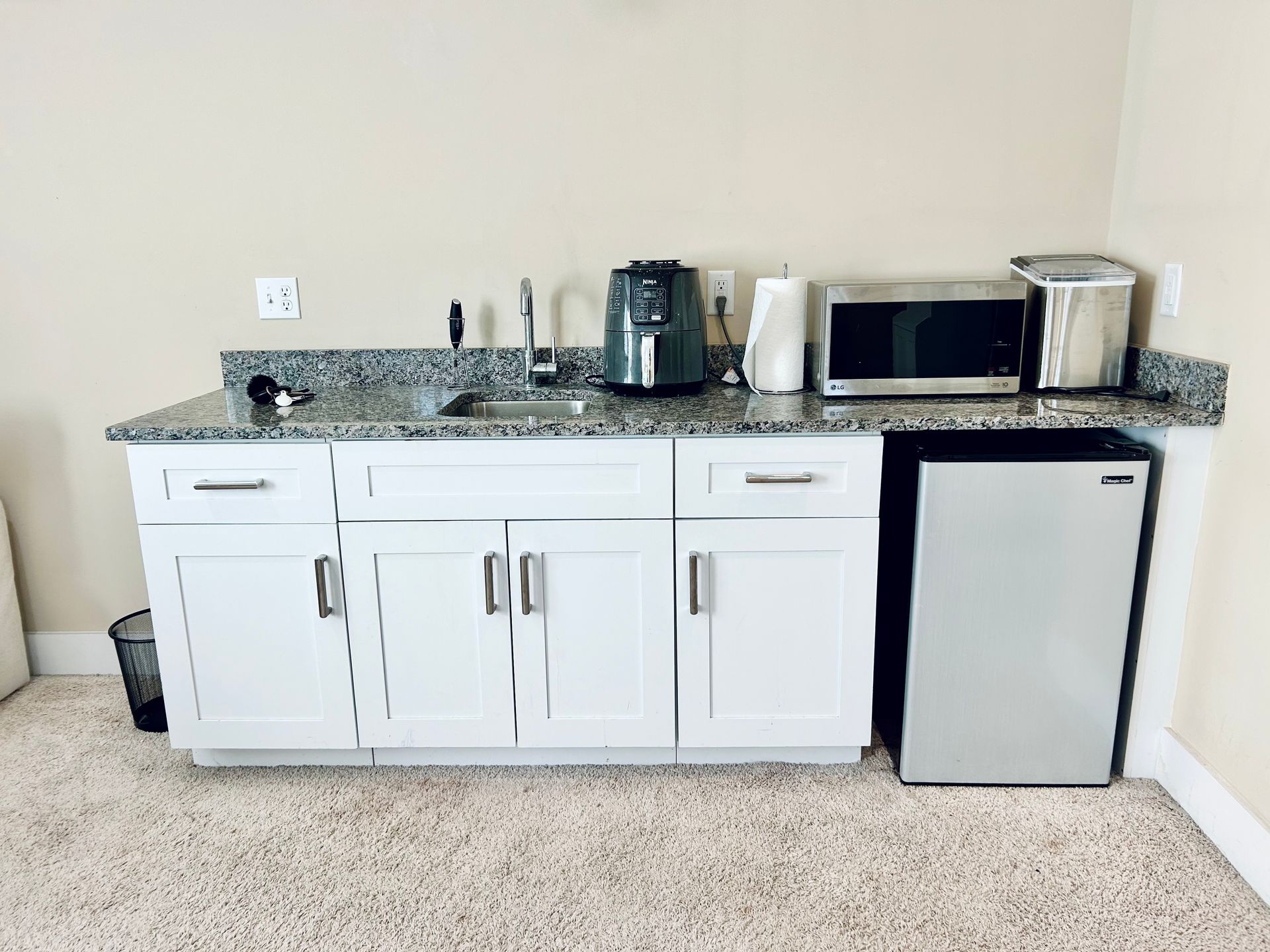 Dine out at popular nearby restaurants or dine in at your temporary home... Kitchenette is stocked with necessities like dishes and glassware, microwave, Ninja Foodi air fryer, mini fridge, freezer, and ice maker.